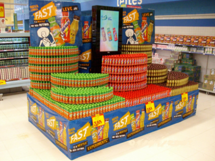 محصولات معمولا به گونهای چیده می شوند که رنگشان درخشان، جذاب و هوس انگیز به نظر برسد. این کار با قراردادن رنگهای متضاد در کنار هم انجام میشود. تکنیک رنگهای متضاد در ترکیب با تکنیک چیدمان زاویه دار به کار میرود. چیدمان محصولات به صورت هنرمندانه چیده شده است و ما را وسوسه میکند. رنگ چیدمانها یکی از مهمترین عواملی است که خریداران را به سمت خود میکشاند.